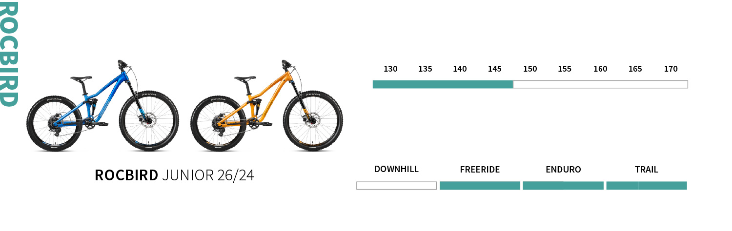 Die kleinere Version des Rocbird Junior, die für die jüngsten Fahrer entwickelt wurde, rollt auf einem 26„/24“-Mini-Mullet-Setup. Dieses Bike ist für Kinder mit einer Körpergröße von ca. 130–145 cm gedacht und bietet die ganze Spannung eines Enduro-Bikes in voller Größe in einem Rahmen, der perfekt auf kleine Fahrer zugeschnitten ist.