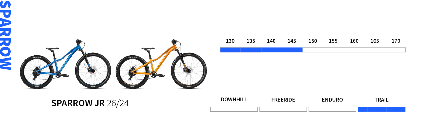 Ein gut ausgestattetes, erschwingliches Fahrrad für junge Fahrer mit Luftfedergabel? Gibt es das oder ist das nur ein Mythos? Wir haben die Antwort auf diese Frage! Es handelt sich um unsere Kinderfahrradlinie mit Sparrow Junior Bikes, die in zwei Laufradgrößen erhältlich sind: 27,5“ / 26“ und 26“ / 24“. Warum wir uns für die Mullet Version entschieden haben? Ganz einfach: Ein kleineres Hinterrad sorgt für mehr Agilität und mehr Spaß für unsere kleinen Shredder, während ein größeres Vorderrad mehr Komfort, Traktion und Vertrauen bei den ersten Schritten in der MTB-Welt bietet.