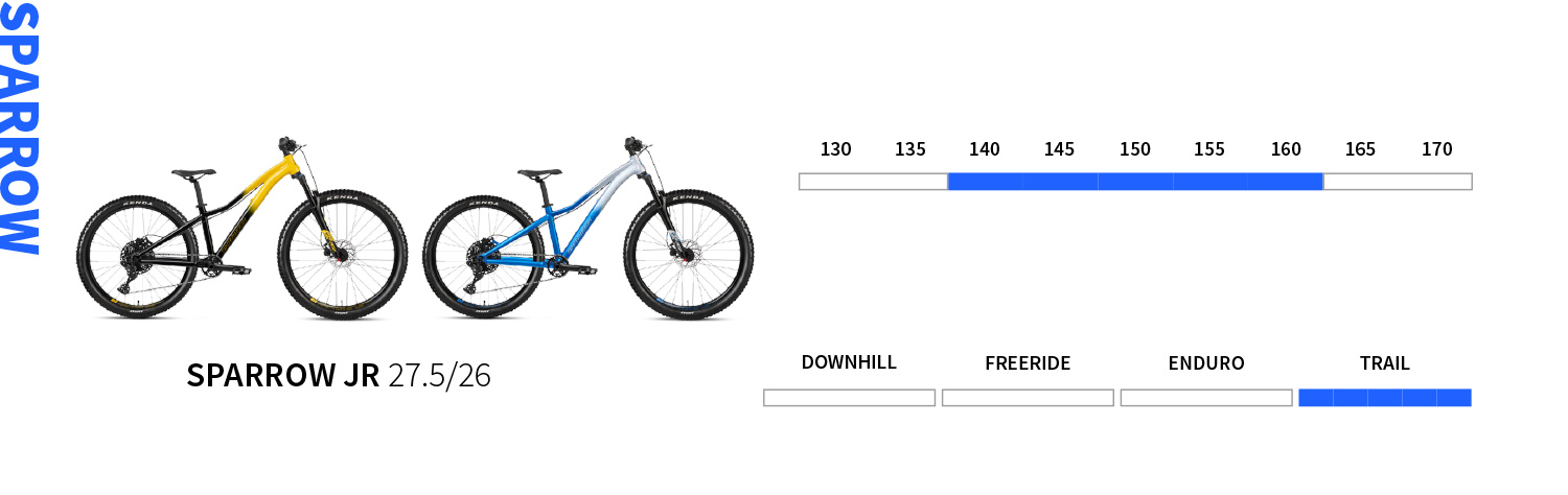 Ein gut ausgestattetes, erschwingliches Fahrrad für junge Fahrer mit Luftfedergabel? Gibt es das oder ist das nur ein Mythos? Wir haben die Antwort auf diese Frage! Es handelt sich um unsere Kinderfahrradlinie mit Sparrow Junior Bikes, die in zwei Laufradgrößen erhältlich sind: 27,5“ / 26“ und 26“ / 24“. Warum wir uns für die Mullet Version entschieden haben? Ganz einfach: Ein kleineres Hinterrad sorgt für mehr Agilität und mehr Spaß für unsere kleinen Shredder, während ein größeres Vorderrad mehr Komfort, Traktion und Vertrauen bei den ersten Schritten in der MTB-Welt bietet.